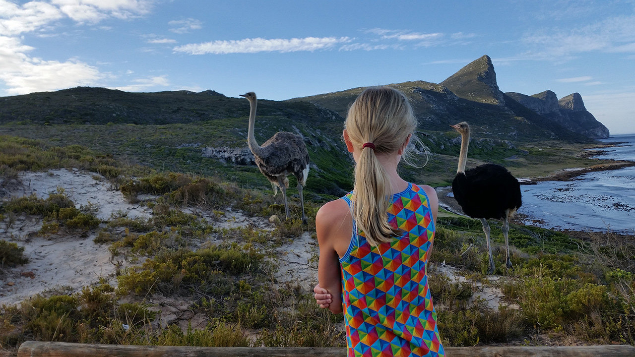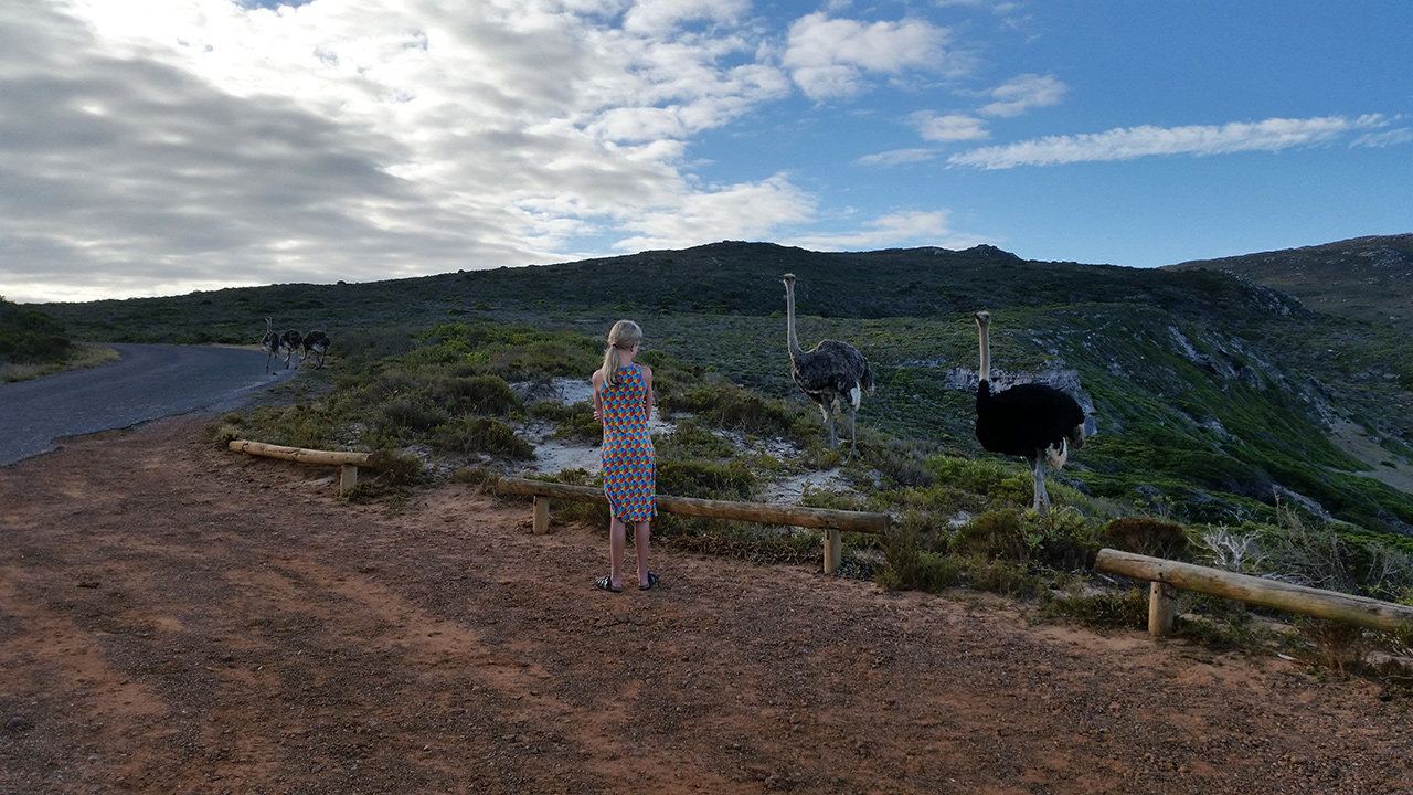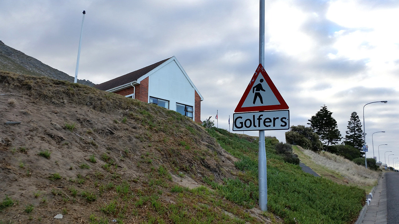 Am Ende begegneten wir noch einer Straußenfamilie. Auf dem Heimweg entdeckten wir zwei Straßenschilder; auf dem ersten stand, dass Pinguine die Straße überqueren und auf dem zweiten stand „golfers“ (siehe Foto).