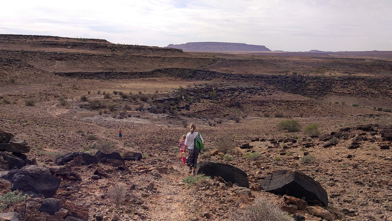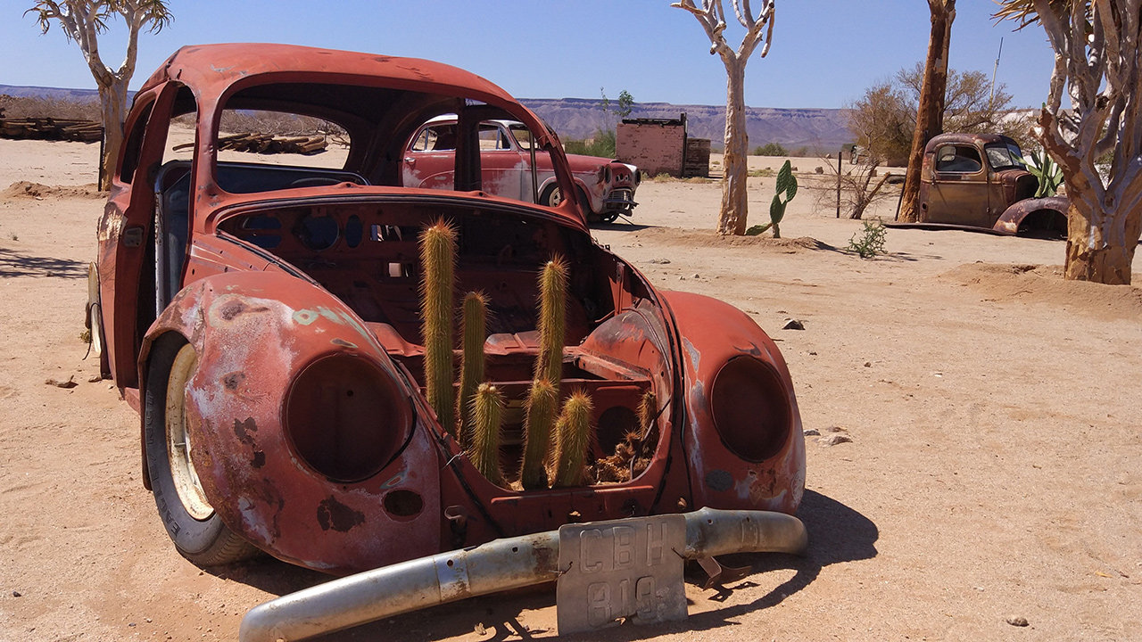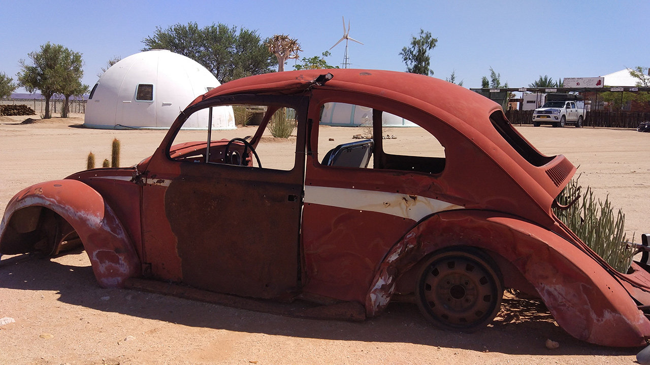 Von Alte Kalköfen aus ging es dann weiter in den Süden. Weiter durch die Einöde Namibias, vor allem über Schotterpisten durch die Wüste. Gegen Mittag legten wir einen Zwischenstopp für den hier üblichen Apfelstrudel ein. Die Guestfarm hatte einen gut sortierten Souvenirladen, in dem die meisten von uns fündig wurden (jetzt müssen wir den Kram schließlich nur noch nach Deutschland schleppen). Außerdem hatte die Gastgeberin interessante Geschichten zu erzählen, über eine französische Familie mit zwei jüngeren Kindern, die von Ägypten nach Kapstadt gereist ist – mit Fahrrädern! Ein andermal kam auf dem Hof ein Rollstuhlfahrer vorbei (wohlgemerkt mitten in der namibischen Wüste), geschoben von einem Typen in Spiderman-Kostüm.