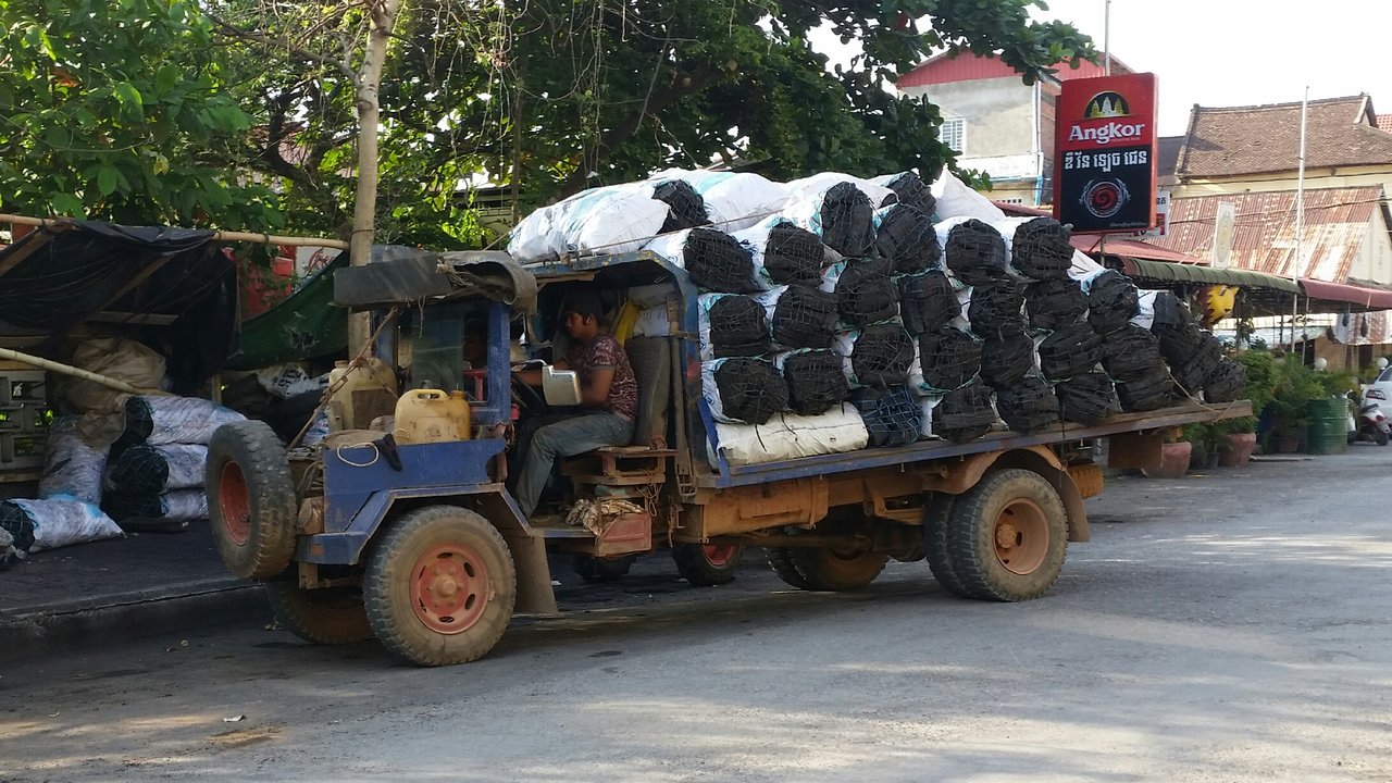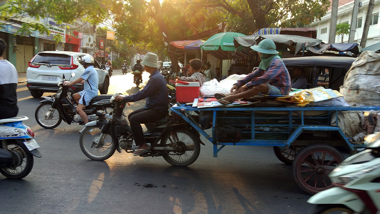 Wichtigstes Verkehrsmittel in Kambodscha ist der Motorroller. Vom Zwölfjährigen bis zum Greis ist hier nahezu jeder damit unterwegs. Allein, aber gerne auch mal zu dritt oder viert, sofern Kinder mitfahren, oder auch mal mit Hund. Helmpflicht existiert nicht und ein Führerschein ist auch nicht notwendig. Mit den von uns geliehenen Hondas (125ccm) hätten wir Zuhause mit Führerschein Klasse 3 nicht einen Meter fahren dürfen. Hier konnten wir damit bequem die Gegend erkunden. Die Straßen teilt man sich mit allerlei anderen Gefährten. Ohne Frage ist das Tuk-Tuk neben dem Piaggio-APE-Kabinenroller (bzw. dessen indisches Pendant Bajaj RE) das Touristentransportmittel schlechthin. Das Auftanken dieser Verkehrsmittel ist übrigens sehr einfach, überall am Straßenrand gibt es Stände mit Wasser- oder Colaflaschen mit einer gelblichen Flüssigkeit. Dies ist der Sprit, ein Liter ist für unter einem Dollar zu erwerben. Tuk-Tuk-Fahrer ist übrigens ein reiner Männerberuf. Manchmal werden mit dem Tuk-Tuk auch Lasten transportiert, dabei gibt es weder in der Höhe, in der Breite oder beim Gewicht irgendwelche Einschränkungen.