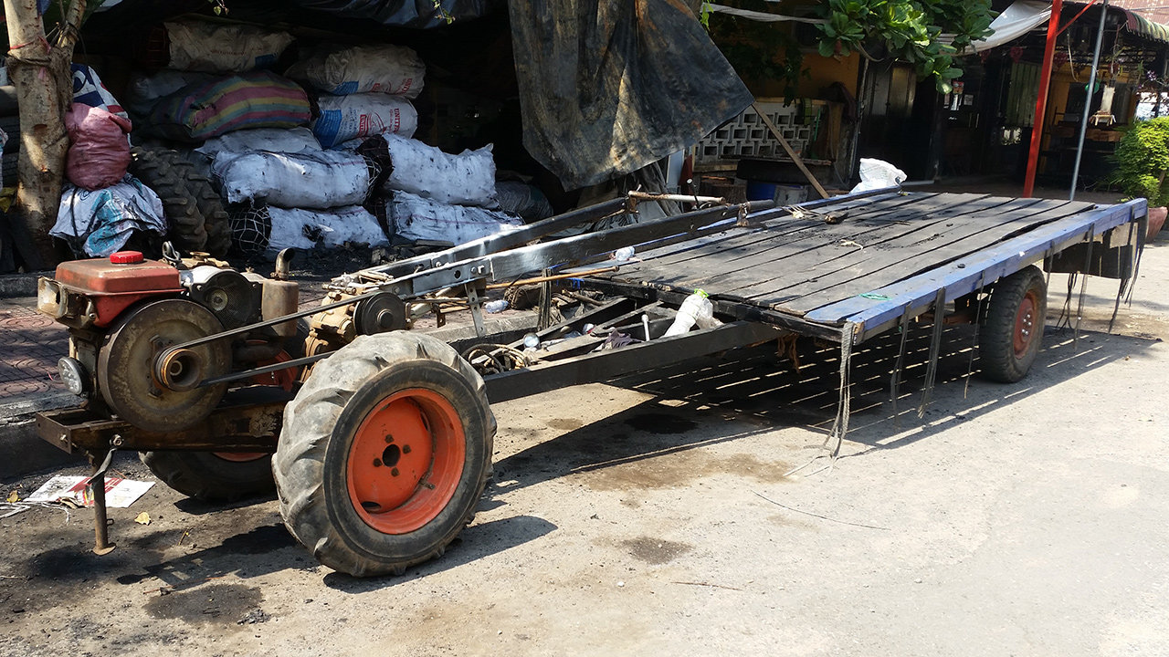 Für noch mehr Lasten gibt es hier Zweiradtraktoren, die wie ein Rasenmähermotor mit Lenkgestänge aussehen. Dahinter befindet sich ein Anhänger mit beliebiger Fracht. Diese Vehikel sind nicht besonders schnell, aber laut.