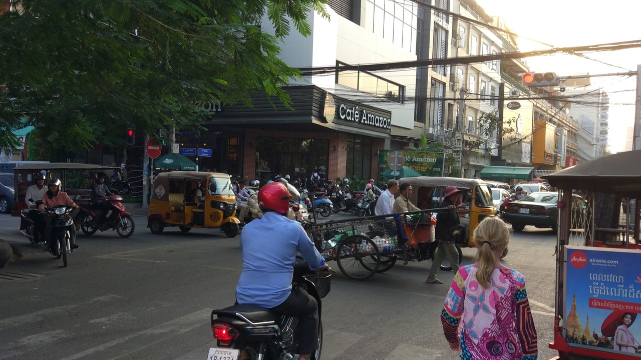 Ein öffentliches Nahverkehrssystem existiert nicht, Busse von unterschiedlicher Qualität (wir haben qualitative Abstufungen in Hinblick auf Komfort und Sicherheit getestet) verbinden die größeren Städte. Dabei muss man für die persönliche Reiseplanung bedenken, dass für 50 Kilometer eher zwei als eine Stunde benötigt werden. Aus diesem Grund entschieden wir uns heute für die 150 Kilometer nach Phnom Penh zehn Dollar mehr auszugeben und mit dem Taxi zu fahren. Das Auto war noch relativ neu und der Fahrer hochmotiviert, uns schnell an unser Ziel zu bringen. Um dies zu bewerkstelligen trat er auf das Gaspedal und machte hemmungslos von der Hupe Gebrauch. So signalisierte er sämtlichen anderen Verkehrsteilnehmern und auch dem kopulierenden Rindvieh auf der Straße eine der wichtigsten kambodschanischen Verkehrsregeln: mehr PS = mehr Macht. Tatsächlich erreichten wir auf diese Weise nach drei Stunden und kurz vor dem gemeinschaftlichen Übergeben unser Ziel.