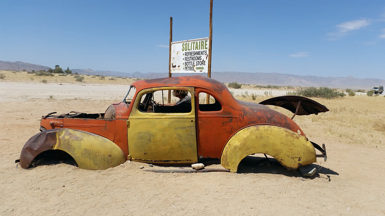 Einen Zwischenstopp machten wir in Solitaire. Dort gab es eine Tankstelle, eine Lodge, eine Autowerkstatt und zwei Cafés. In einem der Cafés probierten wir den Apfelstrudel. Der war noch warm und schmeckte lecker. Danach gönnten Papa und ich uns noch einen Blaubeerkuchen.