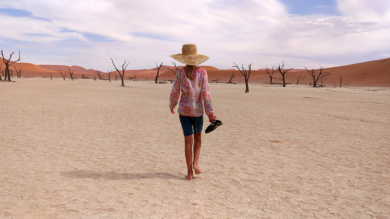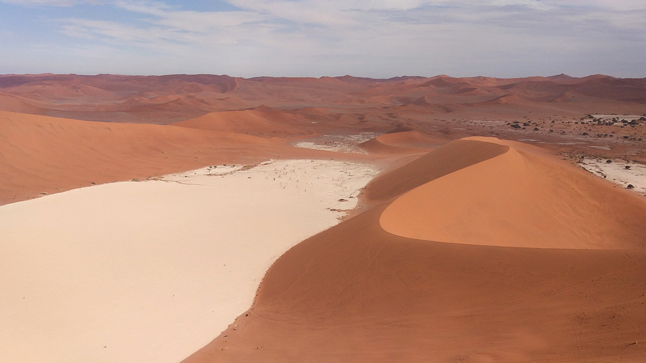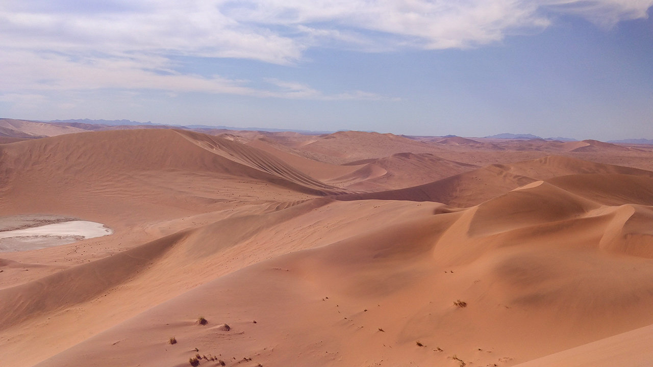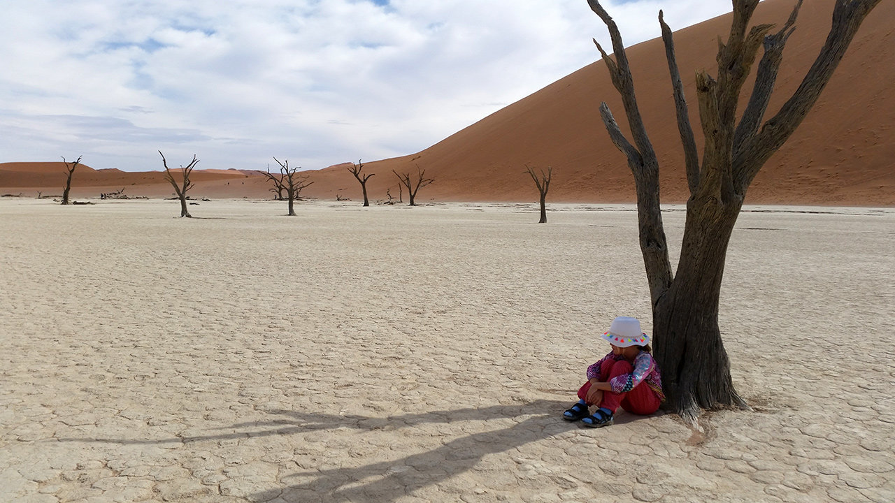Gegen 7:30 Uhr heute morgen fuhren wir wieder sechzig Kilometer nach Sossusvlei. Dort erklommen wir die Düne ,,Big Daddy". Nachdem ich mehrere Senioren und eine Gruppe Schweizer überholte, hatten Papa und ich vielleicht ⅓ der Stecke bis zum Gipfel bewältigt. Dort schossen wir ein paar schöne Fotos, warteten auf Lilo und Mama und ruhten uns aus. Nach ein paar Minuten ging es weiter. An einer Kreuzung zwischen links und rechts weiter nach oben (½ der Strecke) wollten Lilo und Mama nicht noch weiter und wir entschieden, dass Lilo und Mama zurückgehen und Papa und ich bis zur Spitze wandern. Also zogen Papa und ich los, um die Düne zu erobern. Als wir nach einem schweißtreibenden Aufstieg oben ankamen, genossen wir den himmlischen Ausblick. Wie überblickten die gesamte Salz-Pfanne, die, wie sich später herausstellte, gar nicht salzig war, und sahen viele rote Dünen. Nachdem wir ausgiebig Fotos knipsten, machten wir uns auf den Weg nach unten. Für den steilen Abstieg nahmen wir unsere Beine in die Hand und rannten. Unten am Rand der Salz-Pfanne blickten wir zu den winzigen Menschen über uns. Dann überquerten wir die Salz-Pfanne. Auf den ersten ¾ der Salz-Pfanne war einfach nur Lehm und ein ganz bisschen Sand. auf dem letzen ¼ der Salz-Pfanne waren noch ein paar tote Bäume. Das ganze Spektakel dauerte von 7:30-12:30 Uhr. Also 5 Stunden.