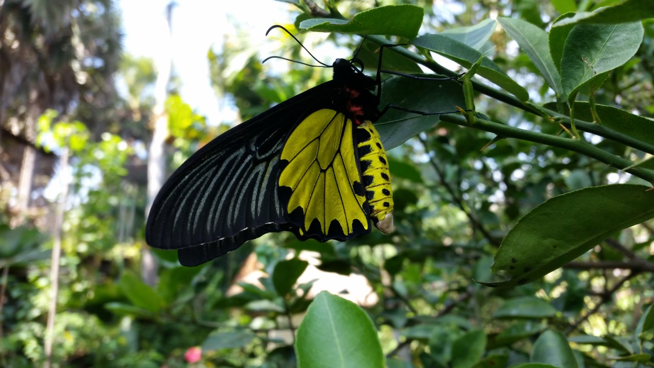 Heute waren wir in einem Schmetterlingsgarten. Wir fuhren lange mit dem Tuk-Tuk über Straßen und Feldwege. Einmal kam ein Schlagloch und wir hüpften sehr hoch. (Tuk-Tuks haben keine Anschnallgurte.) Unterwegs sahen wir Familien mit vier Personen auf einem Motorrad sitzen, überladene Anhänger an Motorrädern und Menschen, die oben auf LKWs saßen (auch ohne Anschnallgurte).