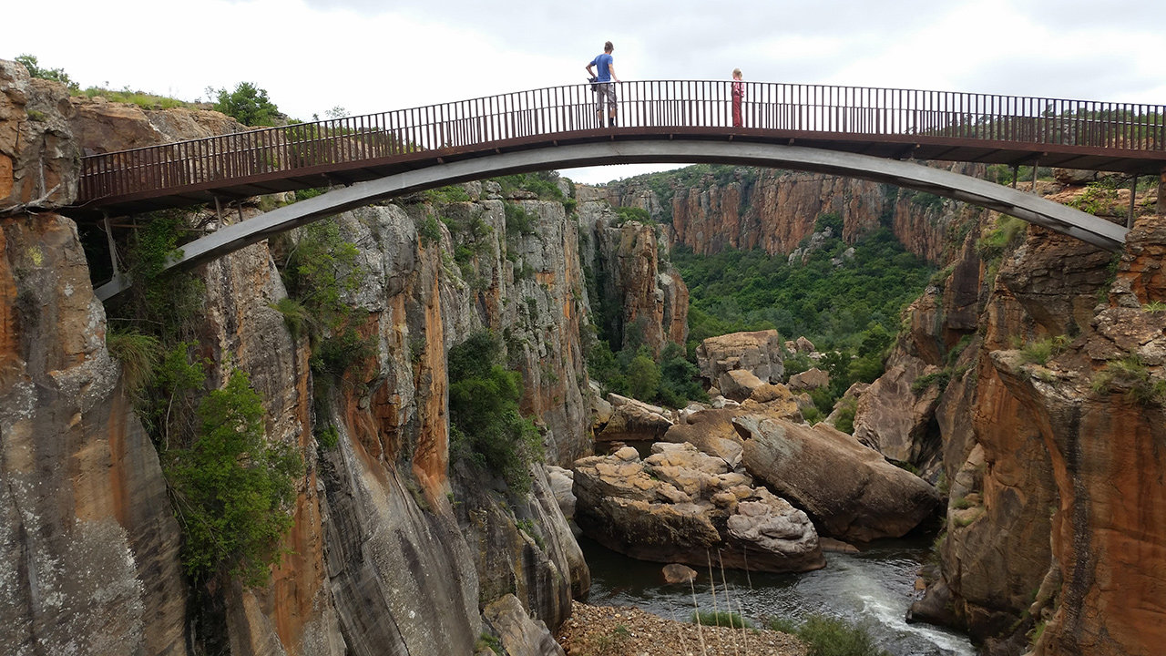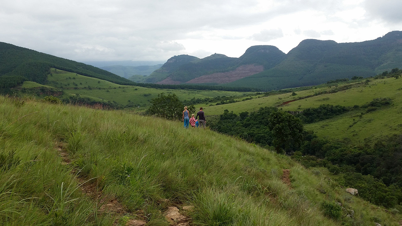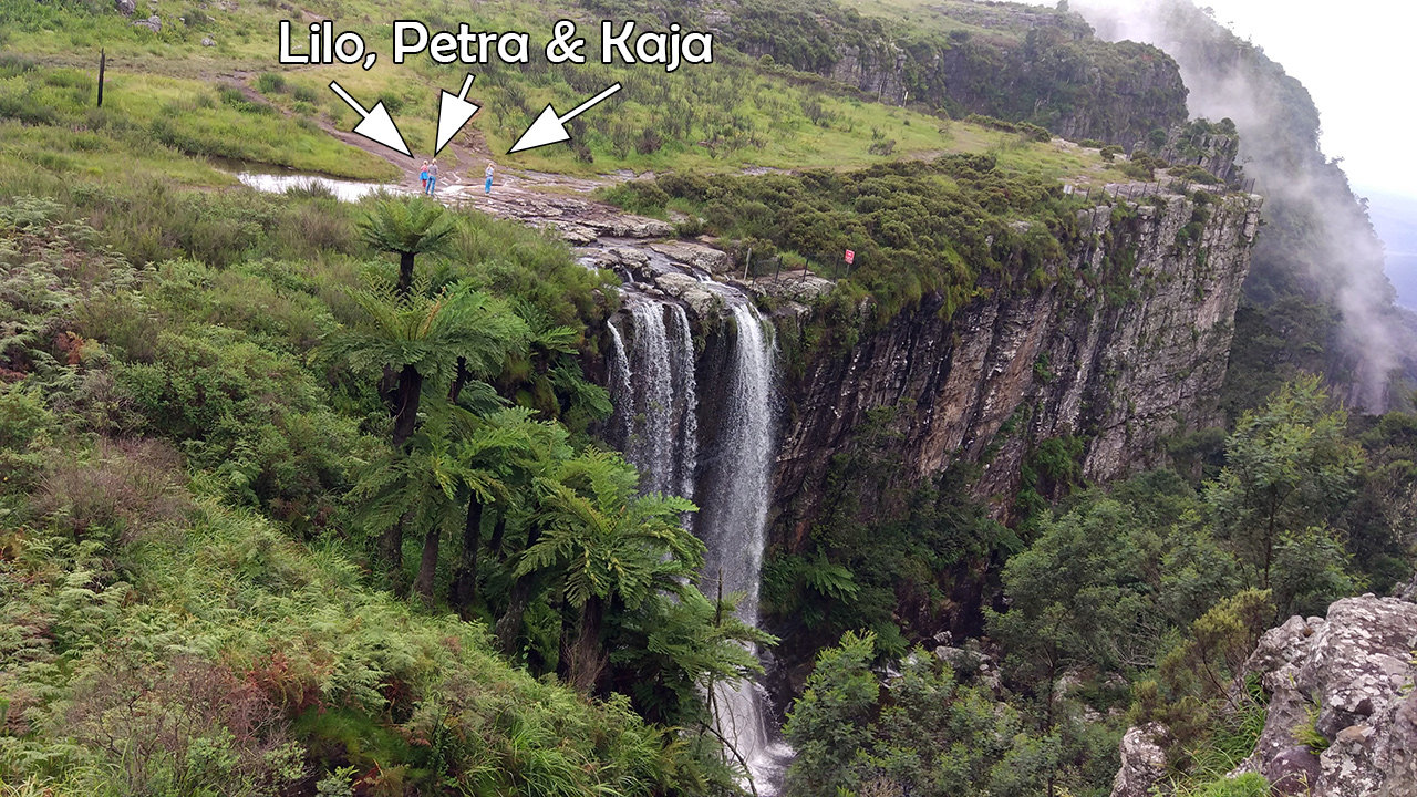 Wir befinden uns in den Drakensbergen, die Gipfel sind bis zu 2000m hoch und hier befindet sich der drittgrößte Canyon der Welt. Man kann sehr weit in die Landschaft sehen und es ist auffällig saftig grün. Ein wahrer Augenschmaus. Wir sind durch dieses grün gewandert und haben Wasserfälle, Potholes und die spektakuläre Aussicht bewundert. Auch eine Höhle haben wir besichtigt, in der der hiesige Stamm noch bis 1964 Unterschlupf fand. Heute leben in der Höhle nur noch Fledermäuse und Stachelschweine, letztere haben wir nicht gesehen. Wenn man dort auf bestimmte Stalagmiten klopft, erzeugen diese ein Echo, daher der Name Echo-Caves. Des Weiteren kreuzte ein Goldgräberstädtchen unseren Weg. In den Flüssen dieses Bergmassivs wurde bis 1971 Gold im Wert von 20 Millionen Pfund herausgeschürft. Zwei der Flüsse, die sich hier in die Tiefe stürzen heißen Treur (Trauer) und Blyde (Freude), weil die ersten weißen Siedler hier einen Teil ihres Trecks an einem Fluss verloren und ihn an einem anderen wiederfanden.