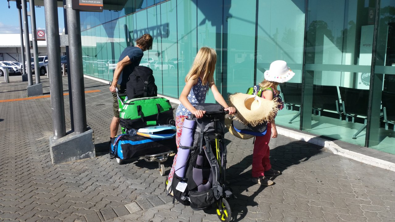 Zuerst fanden wir mitten auf dem Weg einen herrenlosen Kofferwagen. Wir fühlten uns sofort verantwortlich, ihn zum Flughafen zurückzubringen. Dann überraschte uns ein Herr mit dem Angebot eines viel sicheren und kürzeren Weges zum Flughafen. Schon ging es mit ihm durch ein Bürogebäude und kurz darauf standen wir vor unserem Terminal.