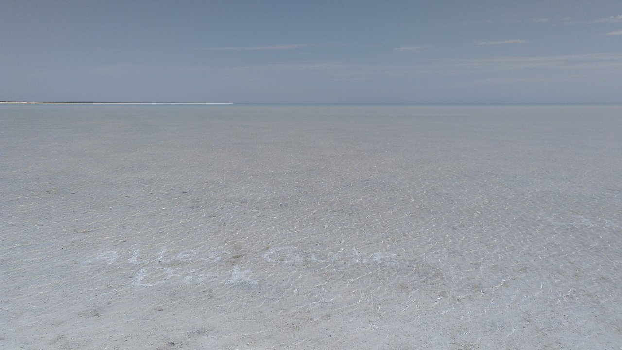 Der Gruß auf dem Bild ist übrigens aus kleinen Muscheln "geschrieben" und wird noch eine Weile am Strand des Shell Beach in der Shark Bay zu lesen sein.