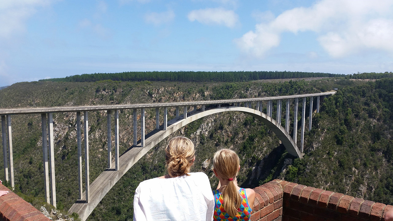 Vor zwei Tagen mussten wir wieder eine längere Strecke mit dem Auto zurücklegen. Auf dem Weg fuhren wir über eine Brücke, an der eine Bungee-Jumping-Station befestigt ist. Es ist die höchste Brücke Afrikas (Bloukrans Bridge, 216 Meter hoch). Dort konnten wir ein paar mutige Touristen beobachten, die sich von der Brücke stürzten.