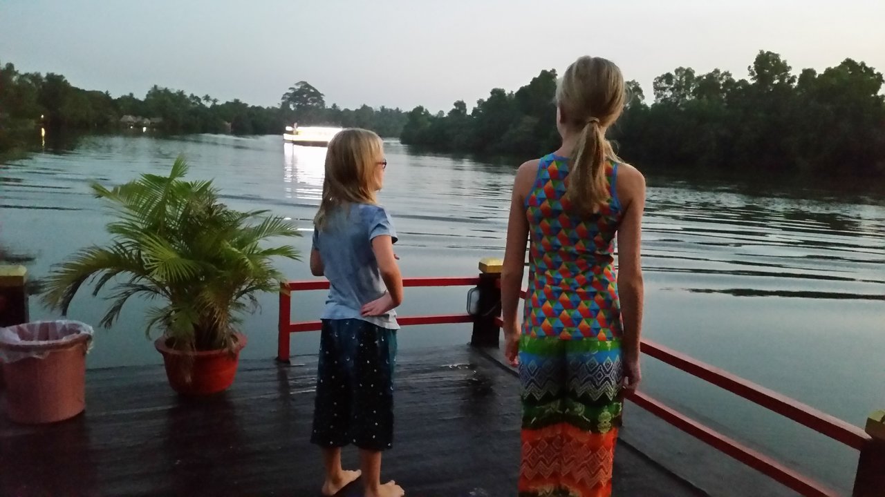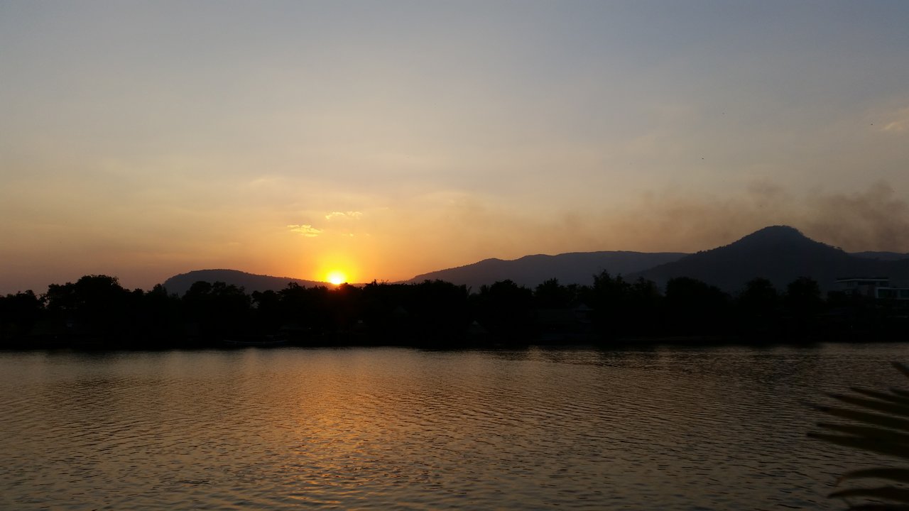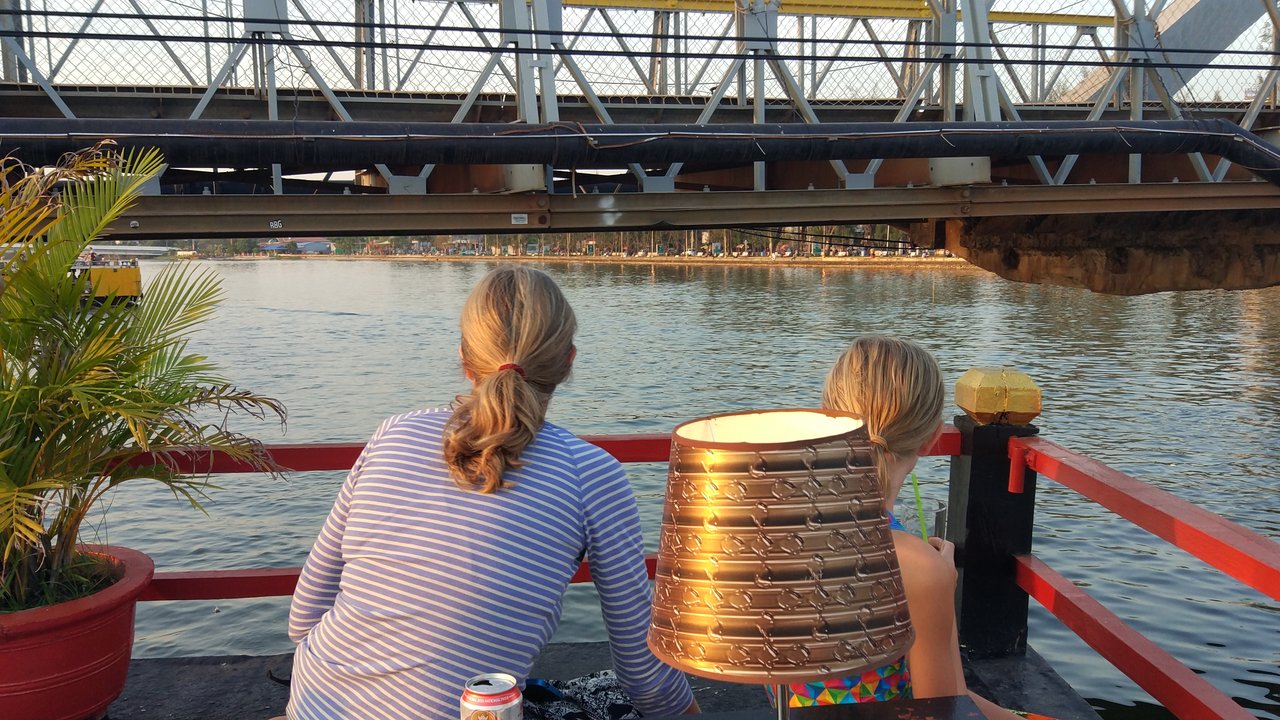 Wir sind unter drei Brücken hergefahren. Diese Brücken waren sehr niedrig, so dass wir uns hinlegen mussten. Eine Brücke ist ein wenig einsturzgefährdet, aber über diese sind wir heute schon mit dem Roller gefahren. Zweimal haben wir es orange leuchten gesehen, einmal war es der Sonnenuntergang, das andere Mal ein Waldbrand. Als es dann dunkel war, haben wir einmal auf dem Wasser Rast gemacht, um die Glühwürmchen zu bestaunen. Sie blinkten gelb. Auf der Rückfahrt war es schon ganz dunkel und die Brücken von Kampot waren bunt beleuchtet.