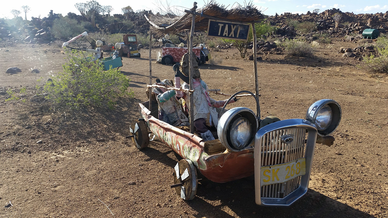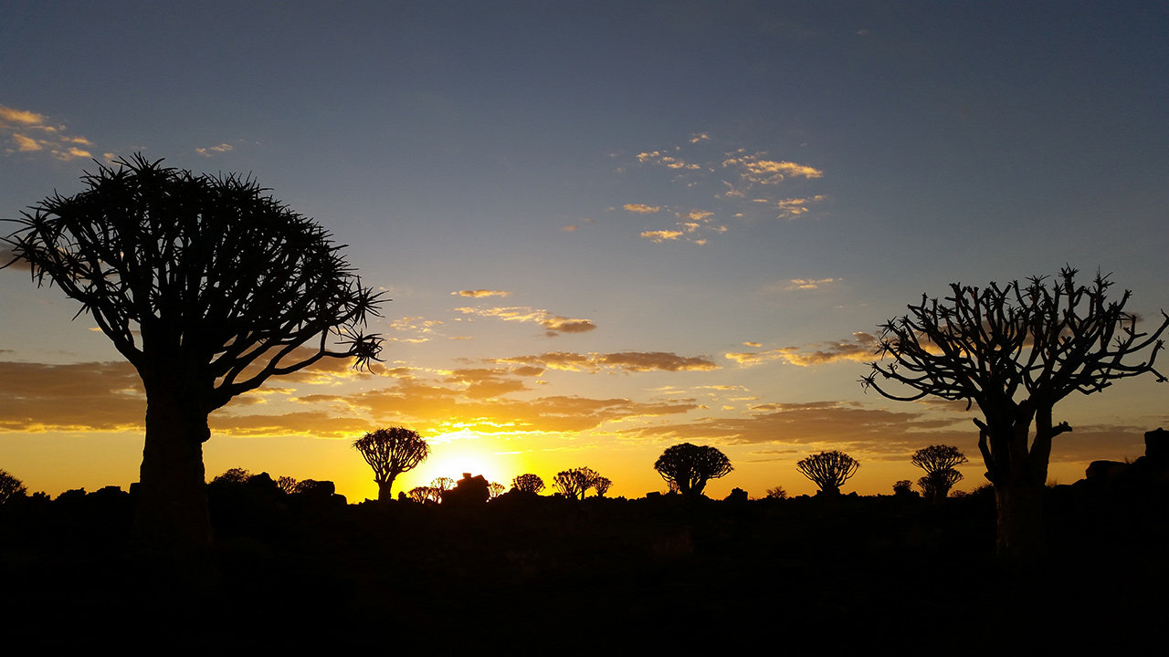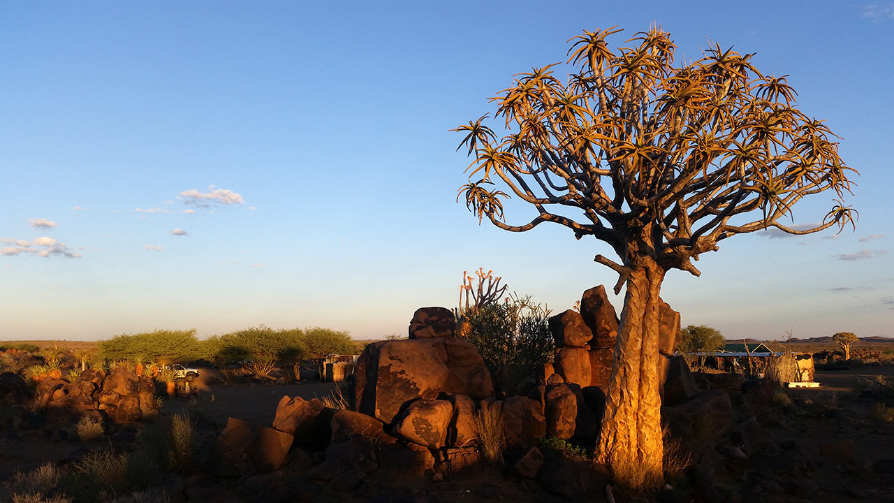 Unser Campingplatz liegt an einem Köcherbaumwald. Die Bäume sehen besonders gut am Abend aus. Außerdem gibt es hier Figuren aus Schrott.