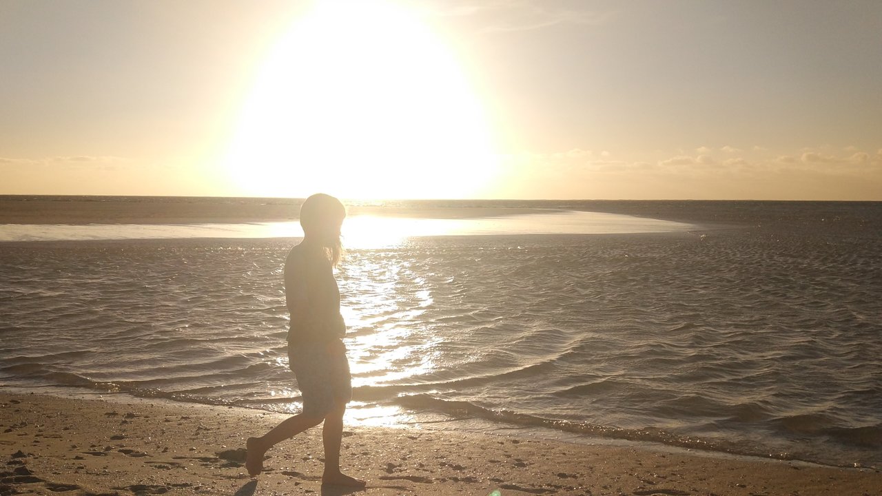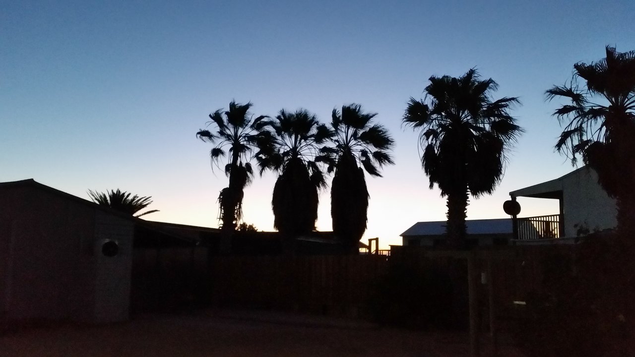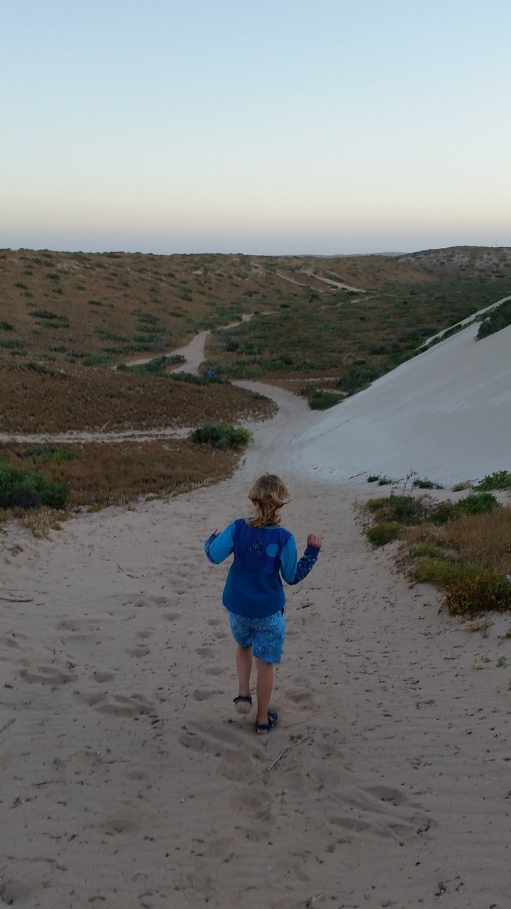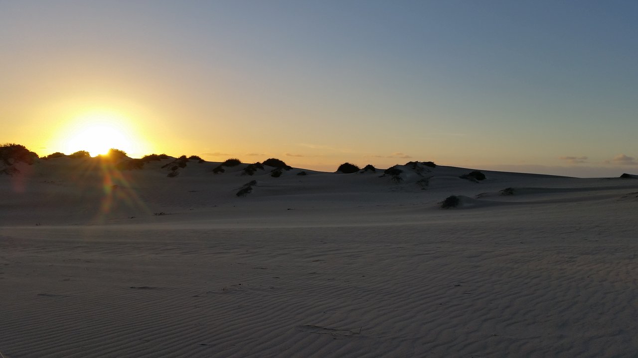 Allerdings geht ein Tag am Meer natürlich nicht ohne Spaziergang an eben diesem. Auf zur Skeleton Bay! In der Kinderstube der Riffhaie haben wir diese nicht gesehen, jedoch harte fliegende Sandkörner auf der Haut gespürt. Daher wollte Lilo lieber einen anderen Rückweg nehmen. Also zurück durch Dünen und Buschland. Ach ja, zwischendurch hat sich die Sonne mal wieder in Windeseile Richtung Horizont verabschiedet. Immerhin gab es noch so viel Helligkeit, um Känguru- und Schlangenspuren zu entdecken. Auch der Weg ließ sich im letzten Abendlicht gerade noch erkennen, bevor wieder der Sternenhimmel mit unzähligen Sternen (weit entfernt von jeglicher Lichtverschmutzung) die Nacht ankündigte.