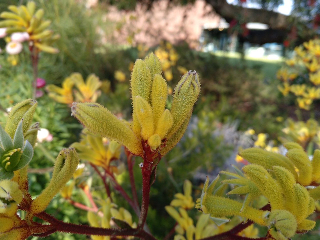 Die Bäume sind aber riesig und die Blumen sehen auch sehr interessant aus. Ist die gelbe Blume eine Strohblume mit ganz harten Blüten?