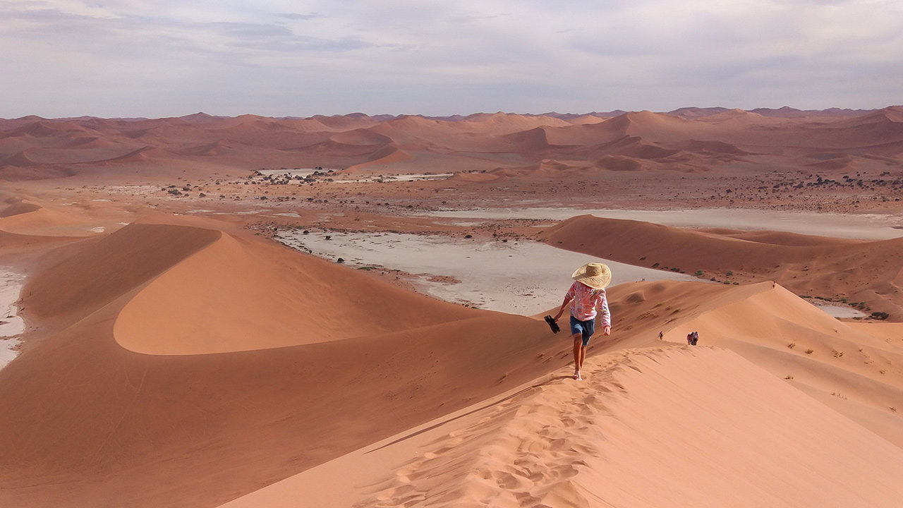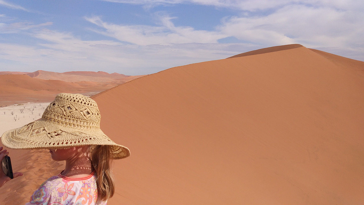 Gegen 7:30 Uhr heute morgen fuhren wir wieder sechzig Kilometer nach Sossusvlei. Dort erklommen wir die Düne ,,Big Daddy". Nachdem ich mehrere Senioren und eine Gruppe Schweizer überholte, hatten Papa und ich vielleicht ⅓ der Stecke bis zum Gipfel bewältigt. Dort schossen wir ein paar schöne Fotos, warteten auf Lilo und Mama und ruhten uns aus. Nach ein paar Minuten ging es weiter. An einer Kreuzung zwischen links und rechts weiter nach oben (½ der Strecke) wollten Lilo und Mama nicht noch weiter und wir entschieden, dass Lilo und Mama zurückgehen und Papa und ich bis zur Spitze wandern. Also zogen Papa und ich los, um die Düne zu erobern. Als wir nach einem schweißtreibenden Aufstieg oben ankamen, genossen wir den himmlischen Ausblick. Wie überblickten die gesamte Salz-Pfanne, die, wie sich später herausstellte, gar nicht salzig war, und sahen viele rote Dünen. Nachdem wir ausgiebig Fotos knipsten, machten wir uns auf den Weg nach unten. Für den steilen Abstieg nahmen wir unsere Beine in die Hand und rannten. Unten am Rand der Salz-Pfanne blickten wir zu den winzigen Menschen über uns. Dann überquerten wir die Salz-Pfanne. Auf den ersten ¾ der Salz-Pfanne war einfach nur Lehm und ein ganz bisschen Sand. auf dem letzen ¼ der Salz-Pfanne waren noch ein paar tote Bäume. Das ganze Spektakel dauerte von 7:30-12:30 Uhr. Also 5 Stunden.