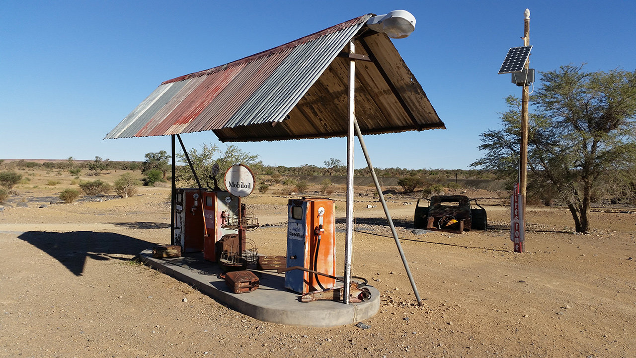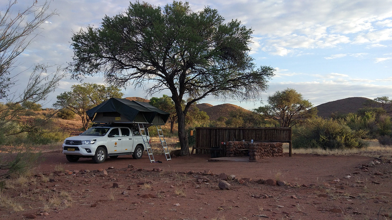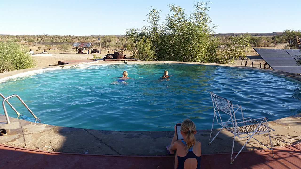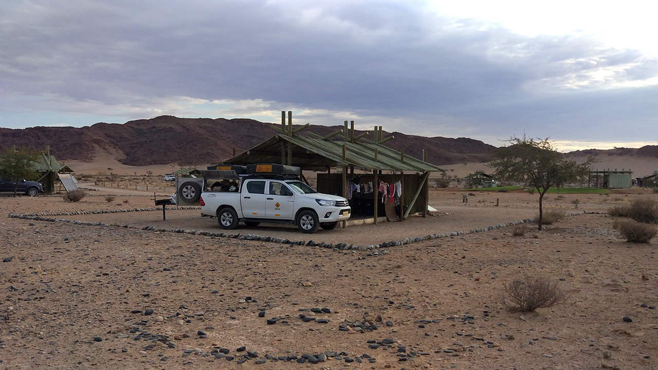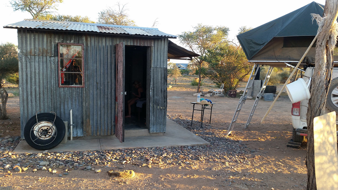 Es geht weiter in den Süden. Wir schaffen täglich ungefähr 200 km, das sind drei bis vier Stunden Fahrzeit, je nach Straßenqualität. Dazu nutzen wir gerne die Mittagshitze, wenn es zu heiß für jegliche Aktivitäten ist. Die Landschaft, die wir durchfahren, zeichnet sich durch Berge und Ebenen aus, die man unglaublich weit überblicken kann. Menschliche Ansiedlungen gibt es kaum. Auch auf den Campsites ist außerhalb der Hotspots wenig los. Heute Nacht sind wir allein, gestern gab es einen Mitcamper in 50 Metern Entfernung. Unsere Campsites sind meistens gut ausgestattet, mit eigenem Bad - heute in Form einer Wellblechhütte - und Pool für uns allein. Gestern schliefen wir mit Blick auf Schloss Duwisib. Ein deutscher Baron baute es 1909, um hier eine Schafszucht aufzubauen. Dann entschloss er sich, im ersten Weltkrieg zu kämpfen und kam von dort nicht zurück. Heute sind wir in Altekalkofen, den Ofen zur Ziegelsteinherstellung gibt es noch und darüber hinaus ein Lithoparium. Hier verwirklicht sich jemand in der Zucht von Pflanzen, die wie Steine aussehen. Daneben wird hier viel altes Metall gesammelt und als Objekte drappiert. Irgendwie ist es so eine Art Camping auf dem Schrottplatz.