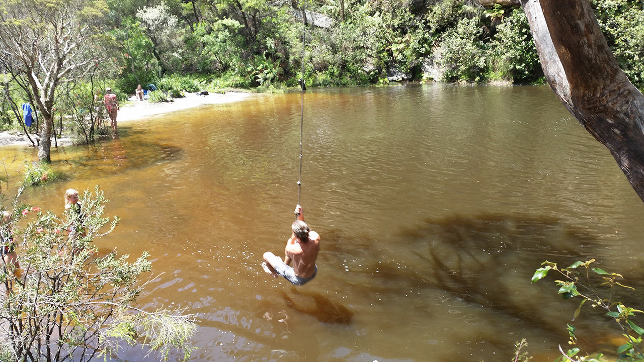 Heute war ein sehr warmer Tag und wir waren auf dem Weg in die Blue Mountains. Um uns ein bisschen abzukühlen, haben wir uns auf die Suche nach den Paradise Falls gemacht. Dazu mussten wir durch dschungelartiges Buschland wandern. Als wir dann nach einer schwitzigen Wanderung endlich am Wasserfall ankamen, war dieser eine sehr erfreuliche Abkühlung, weshalb wir gleich hineinhüpften und uns an einem Seil tarzanmäßig ins Wasser schwangen.