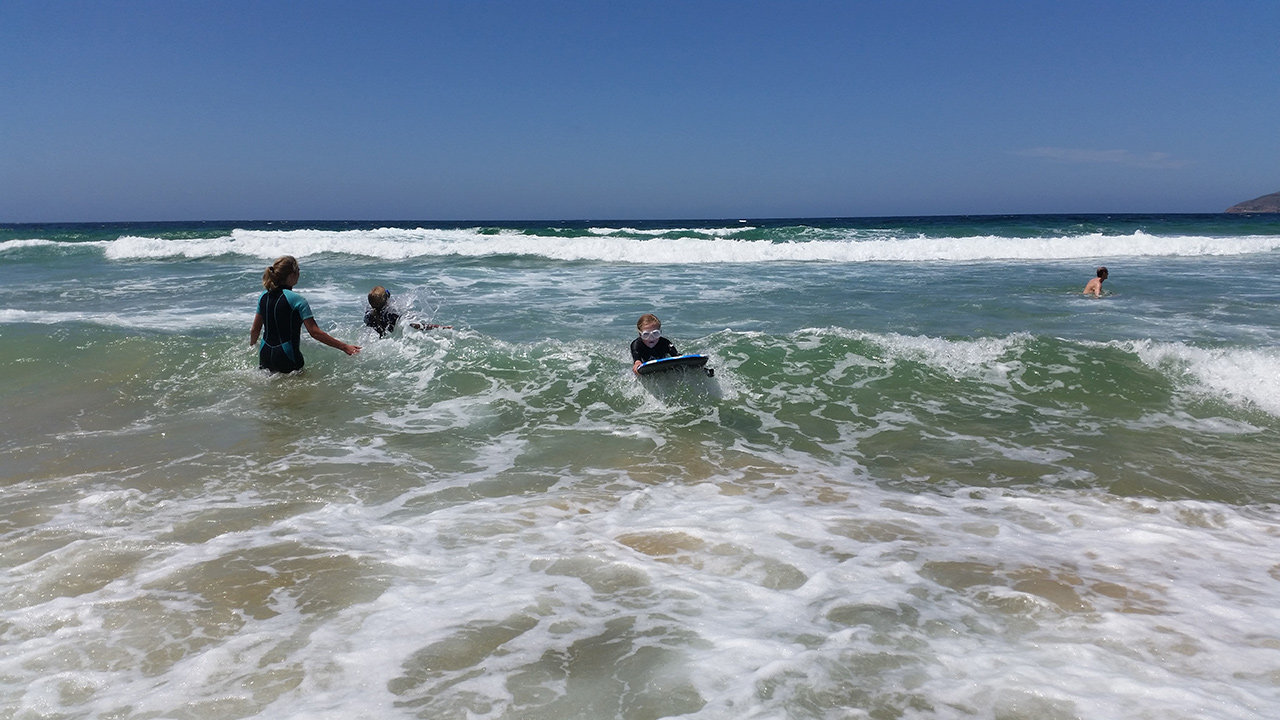 Am nächsten Tag gingen wir dann richtig ins Meer. Dort gab es hohe Wellen. Wir hatten jede Menge Spaß, außerdem gab es am Strand viele Muscheln (sowohl lebende als auch tote) und Reste von Krebsen.